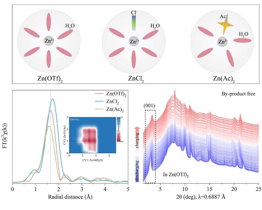 研究选取Zn(OTf)2、ZnCl2和Zn(Ac)2三种典型锌盐电解液,综合运用同步辐射X射线吸收精细结构谱、原位同步辐射X射线衍射及元动力学模拟(Metadynamics)等手段,系统解析了水系电解液中Zn2+的局域配位环境及其电化学行为。研究结果表明,相较于Zn(OTf)2电解液,ZnCl2和Zn(Ac)2体系中Zn2+的近边吸收特征发生显著偏移,证实Cl⁻和Ac⁻参与了Zn2+第一溶剂化壳层的构建。元动力学模拟进一步揭示,Cl⁻和Ac⁻能与Zn2+形成稳定或亚稳态配位构型,而OTf⁻的直接配位在热力学上不利。实验与理论结果相互印证,明确了不同阴离子主导下Zn2+溶剂化结构的本质差异:Zn(OTf)2中主要形成[Zn(H2O)6]2+;ZnCl2中以[Zn(H2O)5Cl]+为主;Zn(Ac)2中则形成[Zn(H2O)4(Ac)]+。
