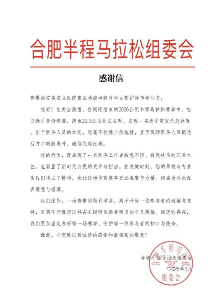 在近日举办的2026合肥半程马拉松赛道上,一名男性选手突然晕厥倒地,正在参赛的附一院南区功能神经外科主管护师李娟紧急施救,帮助这位突发心跳骤停的选手化险为夷。合肥半程马拉松组委会日前发来感谢信,称赞她展现了医务工作者救死扶伤的职业本色,彰显了新时代公民的责任与担当。