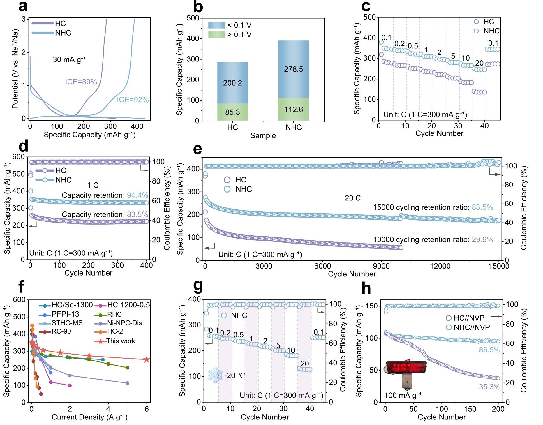 在材料结构优化的基础上,团队开展了钠离子电池性能测试。结果表明,GNDs的构筑协同提升了电池的首次库伦效率(ICE)、倍率性能和可逆比容量等电化学性能(图3)。其中,NHC实现了92%的高ICE及平台主导的高比容量(391.1mAh g−1)。此外,在20 C的高倍率下仍然具有250.8 mAh g−1的可逆比容,循环15000圈容量保持率高达83.5%。低温测试表明NHC在−20°C下的容量保持率仍表现出色。此外,研究团队利用椰壳粉等生物质前驱体进行拓展实验,进一步验证了该共价桥接策略在硬碳结构设计的普适性。