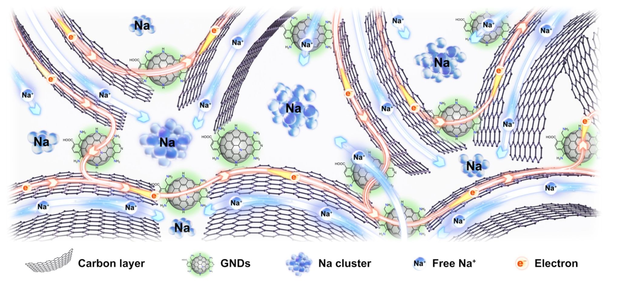 钠离子电池(SIBs)作为锂离子电池的最佳替代品,因其钠资源丰富、长循环寿命和耐低温等优势已经引起学术界和产业界的广泛关注。作为核心负极材料,硬碳电化学性能的优劣决定了SIBs在能源领域的发展前景和应用潜力。硬碳材料由随机堆叠的碳层及结构多样的类石墨畴组成,具有大的碳层间距和丰富的闭孔含量,被认为是钠离子电池的最佳负极候选。然而,硬碳材料内部的无序碳骨架,一方面使电子难以快速传导,另一方面也让钠离子的扩散路径曲折受阻,两者共同导致了动力学极化效应——通俗来说,就是电池在快充时“跟不上”反应节奏。因此,如何协同增强硬碳的电子传导能力与离子传输效率,实现高倍率下高效、稳定储钠,成为突破SIBs快充瓶颈、迈向实用化亟待解决的关键科学问题。