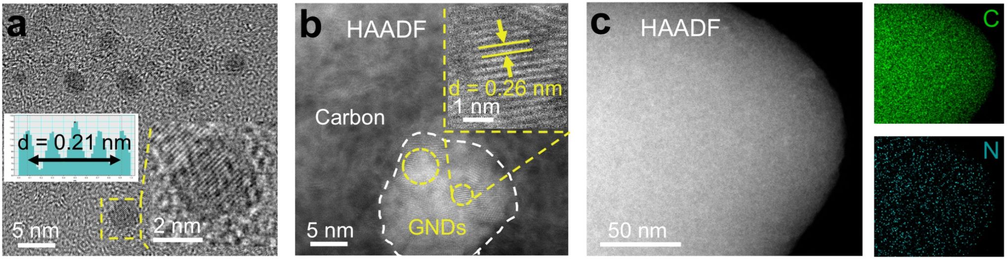 在本研究中,研究人员受自然界生物维管束中信号(电子)和养分(离子)高效协同传输现象启发,提出一种超分子桥接策略,通过在硬碳表面共价桥接CQDs,成功制备了具有电子-离子双连续超快传输特性的氮掺杂硬碳(NHC)。所形成的双连续传输网络(GNDs)均匀嵌入硬碳基质(图2),显著提升了电子电导与离子迁移效率,并通过化学键合增强了硬碳材料的结构稳定性。