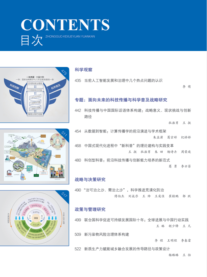 《科技传播与中国国际话语体系构建》一文指出,在新一轮科技革命背景下,中国虽已实现科技实力的历史性跨越,但面临“硬实力”向“话语软实力”转化不畅的挑战。文章创新性地从理念、体制、心态、支点、叙事五个维度构建了以“科学公共性”为核心的科技国际传播创新路径,为塑造可信、可爱、可敬的中国科技形象提供了理论支撑。《从数据到智能:计算传播学的前沿演进与学术框架》一文系统梳理并界定了计算传播学在智能时代的研究对象与核心问题域,追踪计算传播学国际学术共同体的建制化进展的同时,结合政府治理、应急管理等典型场景,提出了可评估、可落地的应用路径,主张将规范与伦理前置为“研究的基础设施”,推动该领域从“可演示的技术”向“可验证的证据”转型,为计算传播学的学科建设与实践应用提供支撑与路径指引。《中国式现代化进程中“新科普”的理论建构与实践变革》立足中国本土实践,系统辨析了“科学普及”与“科技传播”的辩证关系,创造性提出了植根于国家战略驱动的“新科普”理论。该理论构建了“一体两翼·三层三阶”动态系统模型,阐释了科普通过宏观、中观、微观三层互动,实现从“知识互联”“素养共塑”到“生态共创”的螺旋式演进机制,为中国科普事业提供了兼具战略辨识度与系统解释力的原创性分析框架。