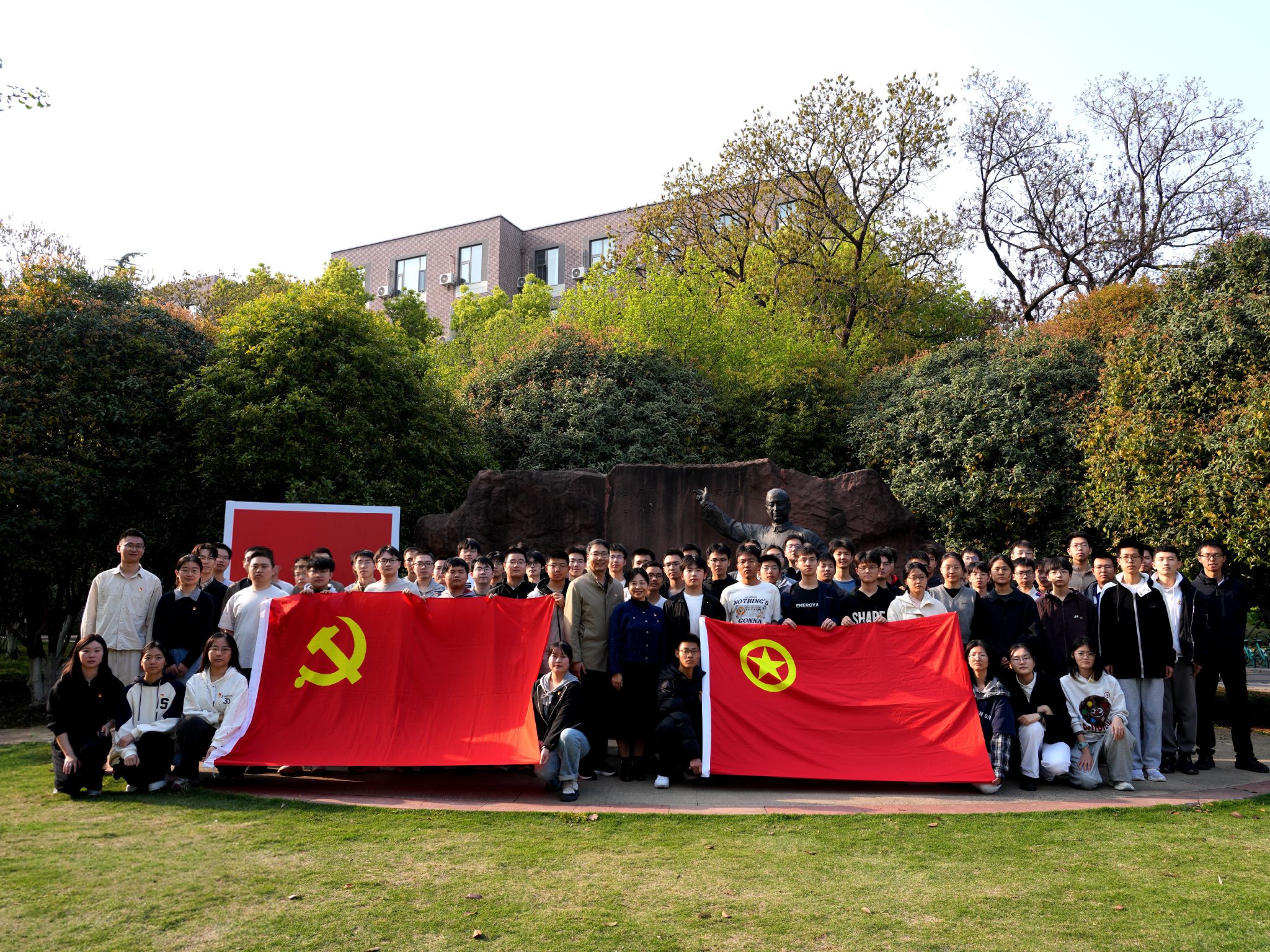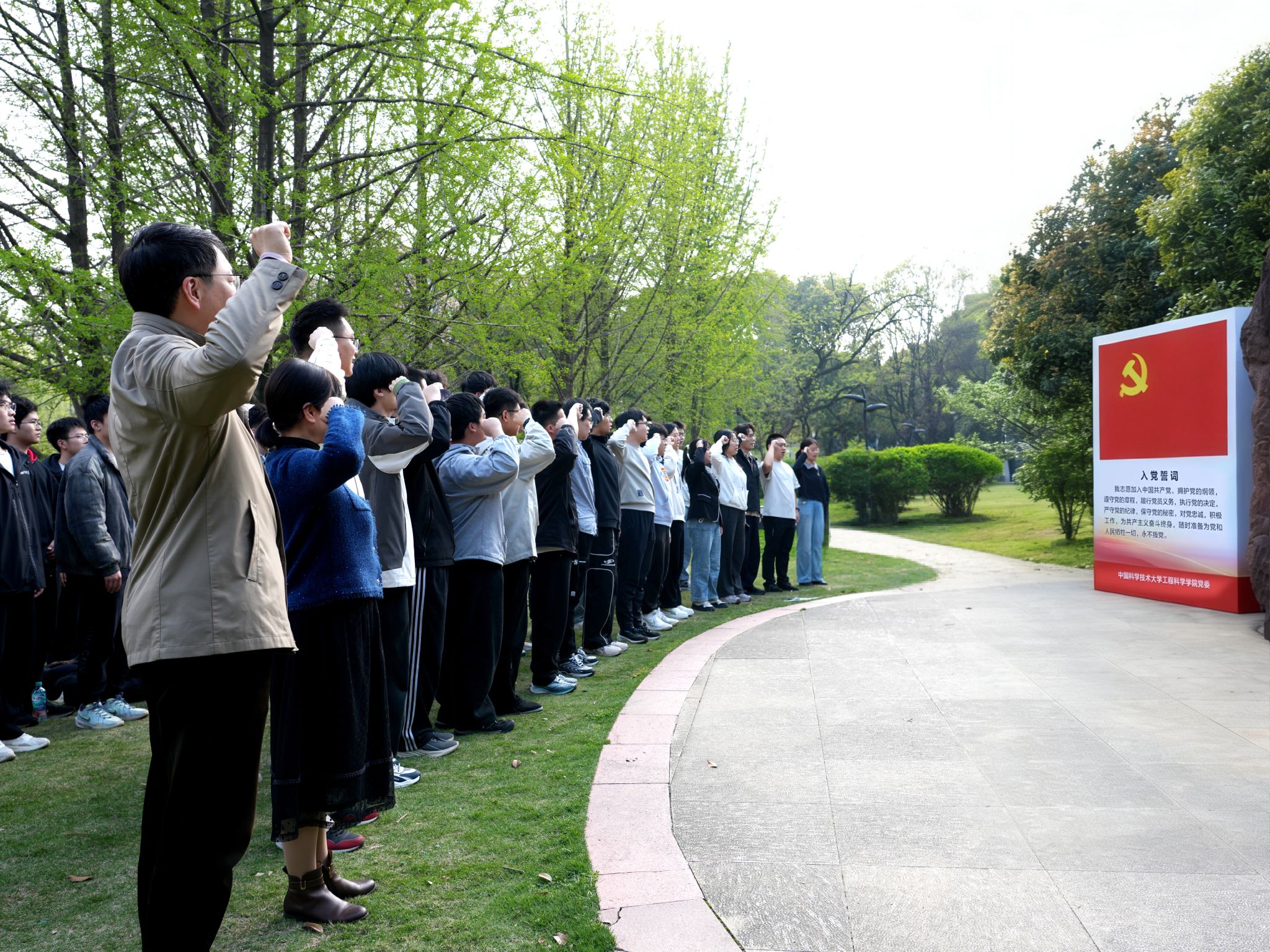 活动最后,本科生预备党员面向党旗庄严宣誓,老党员重温入党誓词,铮铮誓言回荡在雕像前,彰显出青年党员坚定入党初心、勇担时代使命,将传承钱学森精神与践行习近平总书记嘱托融为一体的决心与信念。
