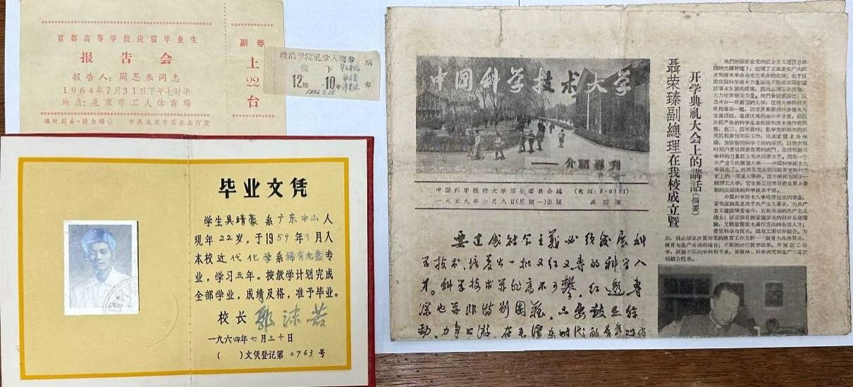 此次吴靖豪校友捐赠的档案资料种类丰富、意义独特,其中包括毕业证书、毕业论文,以及周总理报告会入场券、毕业典礼入场券、中国科大1959年招生专刊、各类纪念封和照片等。