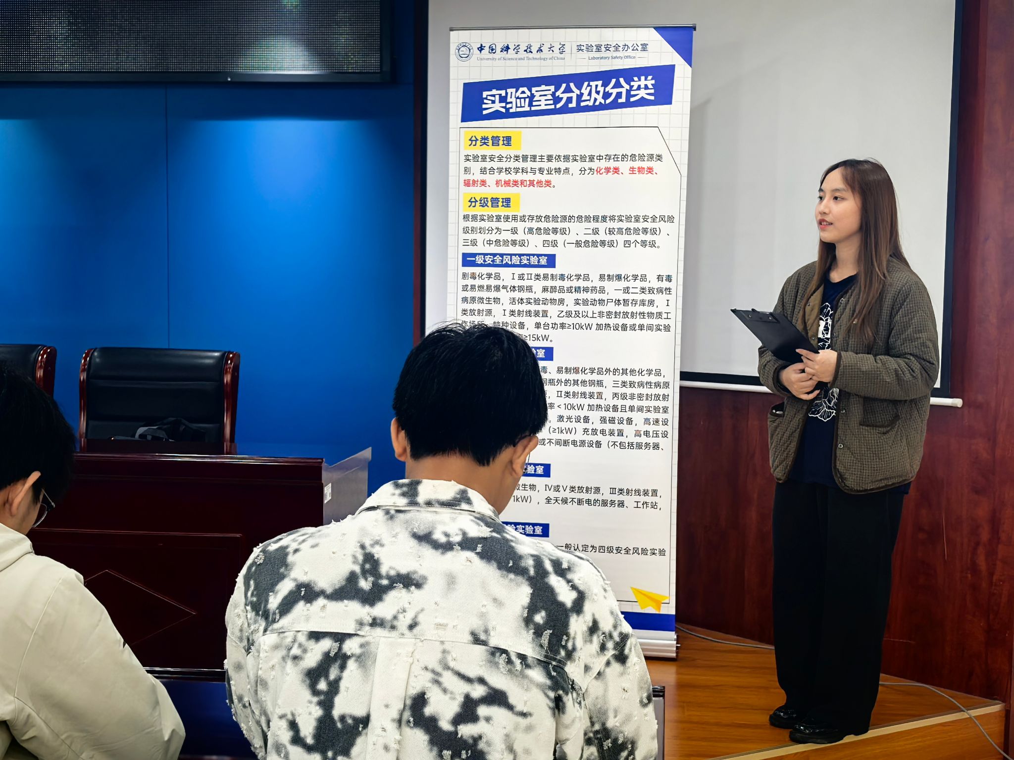 之后,同学们前往参观庐江县消防救援局内的陈陆纪念馆。在庄严肃穆的纪念馆内,同学们跟随讲解,通过一幅幅真实的图片、一件件珍贵的遗物、一段段震撼的影像资料,系统学习了陈陆烈士为救援受灾群众、保护人民生命财产安全而英勇献身的感人事迹。从“龙城卫士”的日常坚守,到2020年庐江洪灾中那句“放心,我一定会守好庐江”的铿锵誓言,再到他七次往返洪流、最终不幸牺牲的壮烈瞬间,英雄的形象在同学们心中变得具体而巍峨。特别是看到那被洪水冲刷变形的救生衣和破损的笔记本,许多同学深受触动,现场气氛凝重而充满敬意。陈陆烈士的事迹让同学们对“赴汤蹈火,服务人民”的消防救援精神有了灵魂深处的理解。同学们纷纷表示,陈陆同志用生命诠释了忠诚与奉献,他是新时代青年的光辉榜样。他的选择,彰显了共产党员的初心和一名消防救援人员的职业担当,这种在危难时刻将个人安危置之度外的精神,是激励大家前行最宝贵的力量。为切实增强学生实验室安全意识,规范实验操作流程,从源头预防安全事故发生,实验室安全办公室向同学们开展了以“实验室分级分类管理及危险化学品安全”为主题的专项培训讲座,实验室安全办公室的马境睿老师为同学们讲解了实验室分级分类的知识,王凯老师为同学们讲解了危险化学品安全知识要点。通过本次培训,让同学们进一步了解了不同等级实验室的安全管理要求和危化品从领用到回收的全流程,有效提升了风险识别与应急处置能力,为筑牢校园实验室安全防线奠定了坚实基础。