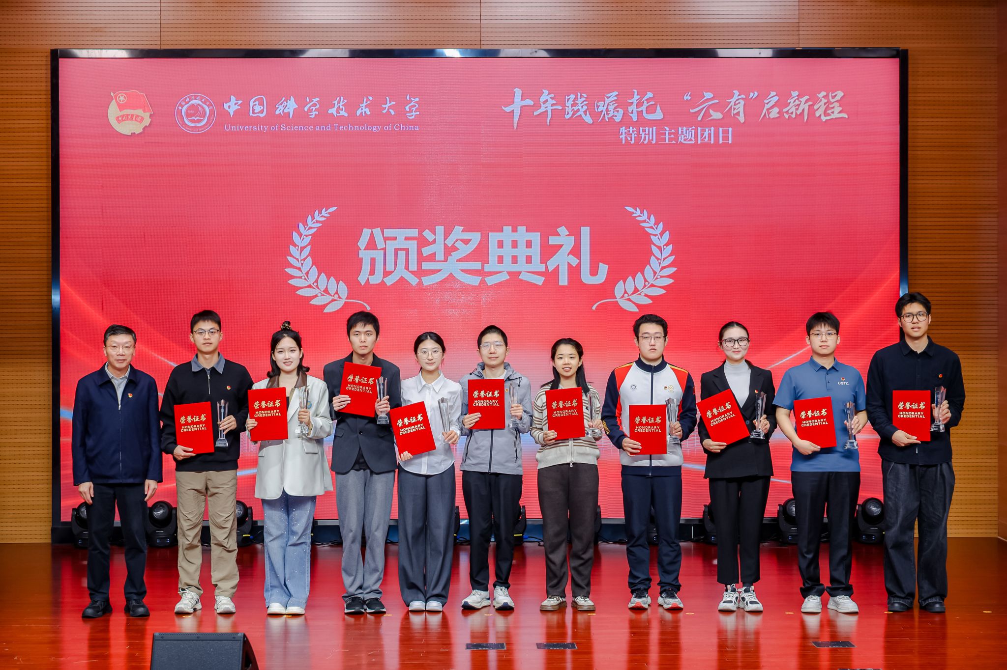 活动现场举行2025年度最美“六有”大学生颁奖仪式,10名优秀同学获表彰,9名同学获提名奖。该评选自2016年启动,十年来累计选树100位先进典型,涵盖爱国荣校、学习科研、创新创业、社会实践、志愿服务等多个领域,集中展现新时代中国科大学子昂扬向上的精神风貌。