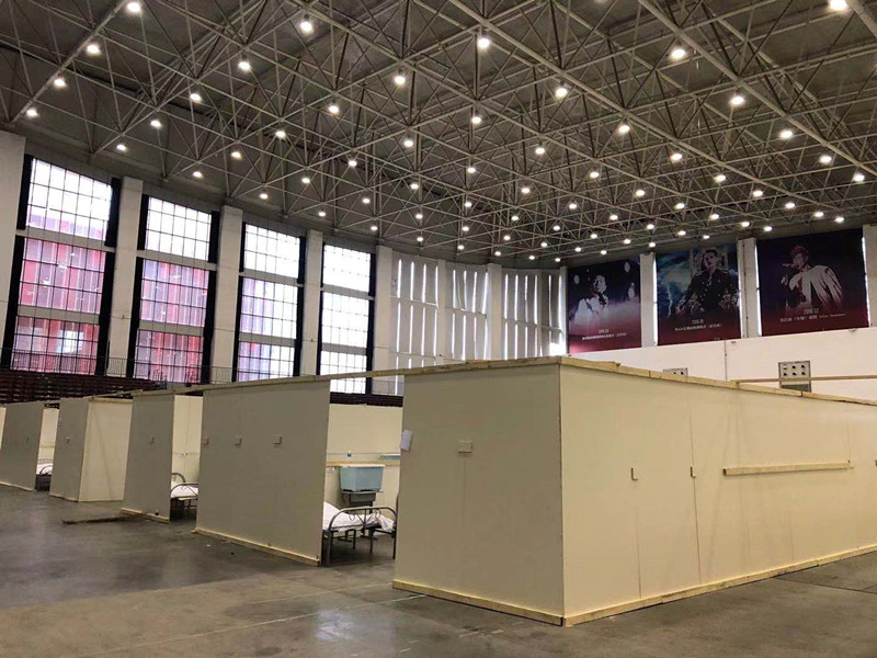 武汉客厅方舱医院医务人员更衣室,方舱医院与金银潭医院隔街相望。