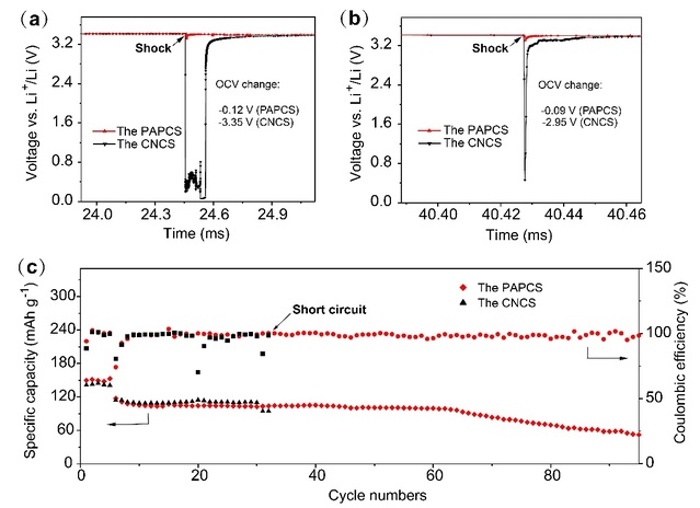 据介绍,相对于使用商业陶瓷隔膜的软包电池,采用仿珍珠层隔膜的软包电池在冲击时表现出较小的开路电压变化和较好的循环稳定性以及高的安全性。