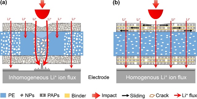 为解决这一难题,中国科大的研究团队在深刻理解自然界珍珠母层高韧性原理基础上,在聚乙烯隔膜表面构建仿珍珠层的“砖泥”有序结构。在受到外力冲击时,仿珍珠母涂层通过片片滑移的作用,有效扩大受力面积,耗散冲击的应力,从而有效保护了隔膜内部孔结构,维持电池内部均匀的锂离子流。