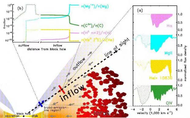 星間物質はインフローによって「食いしん坊」なブラックホールに次々と飲み込まれ、下降する過程で明るい降着円盤を形成する。クエーサーが降着円盤を介して物質をエネルギーに変える過程は既に解明されているが、降着円盤が継続的に物質の供給を得るメカニズムについては、まだ明らかになっていなかった。継続的な物質の供給がなければ、ブラックホールは間もなく周りの物質を使い果たし、クエーサーも発光しなくなる。この供給過程は発光中心から離れており、天体望遠鏡で観測するのは難しい。