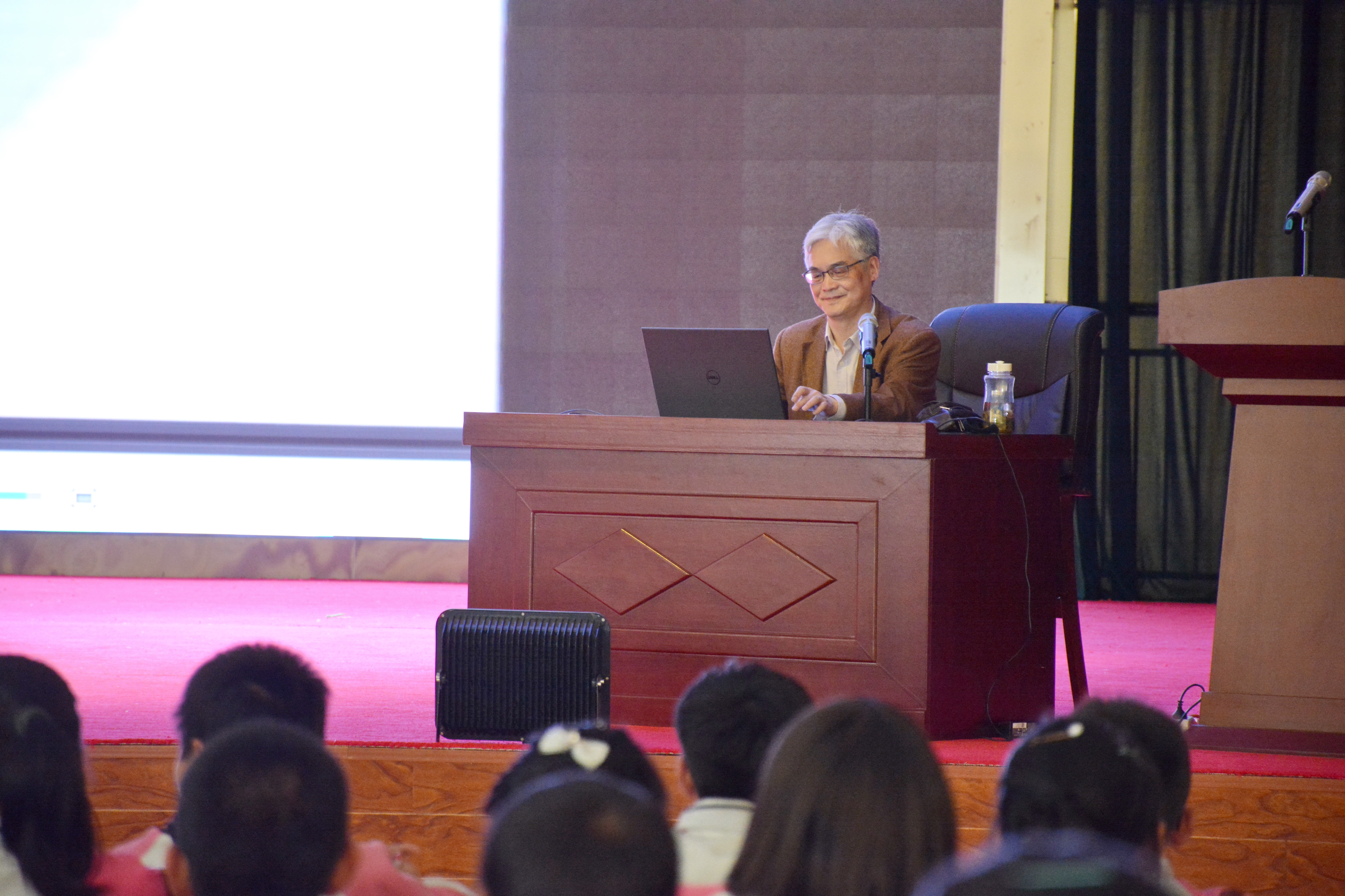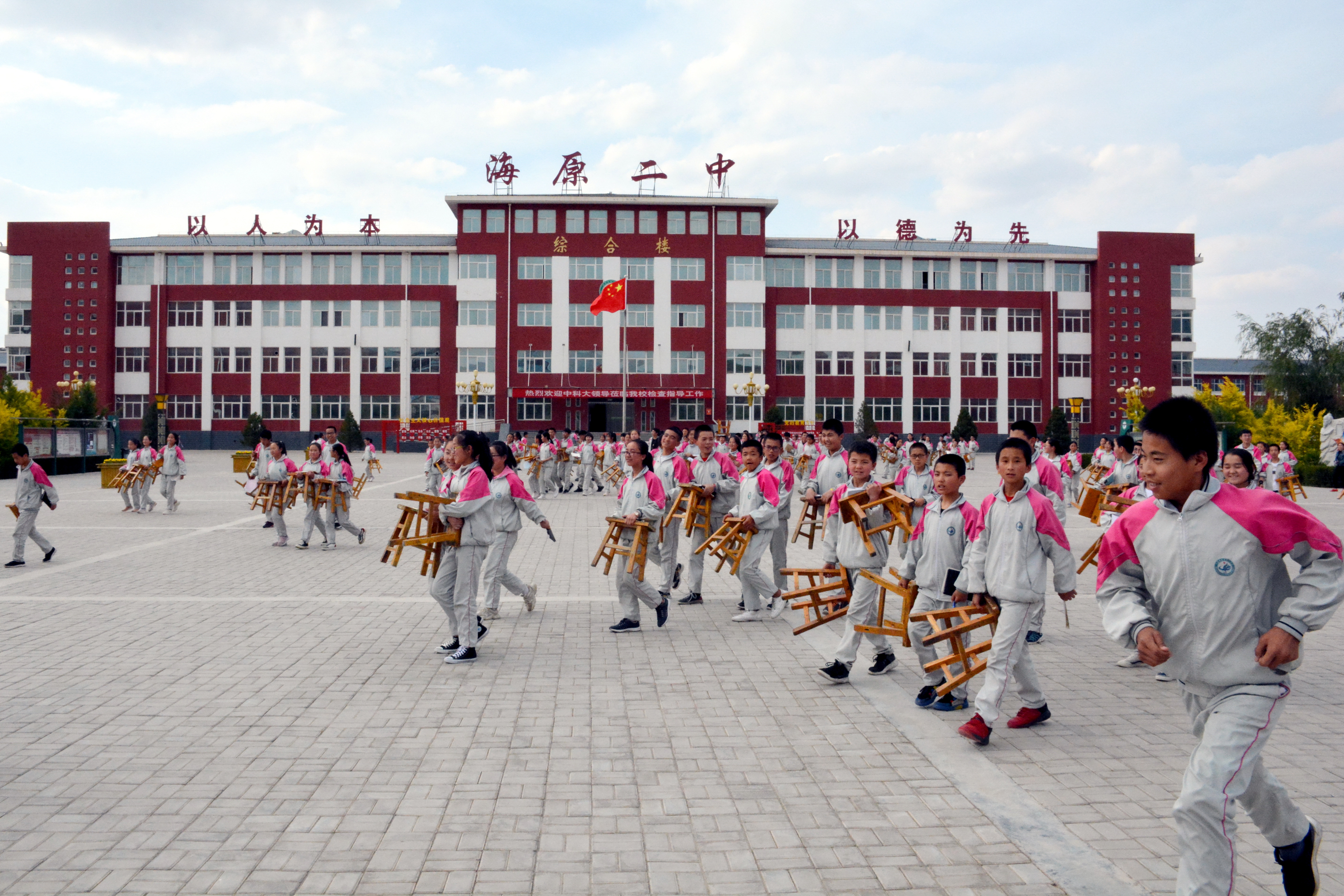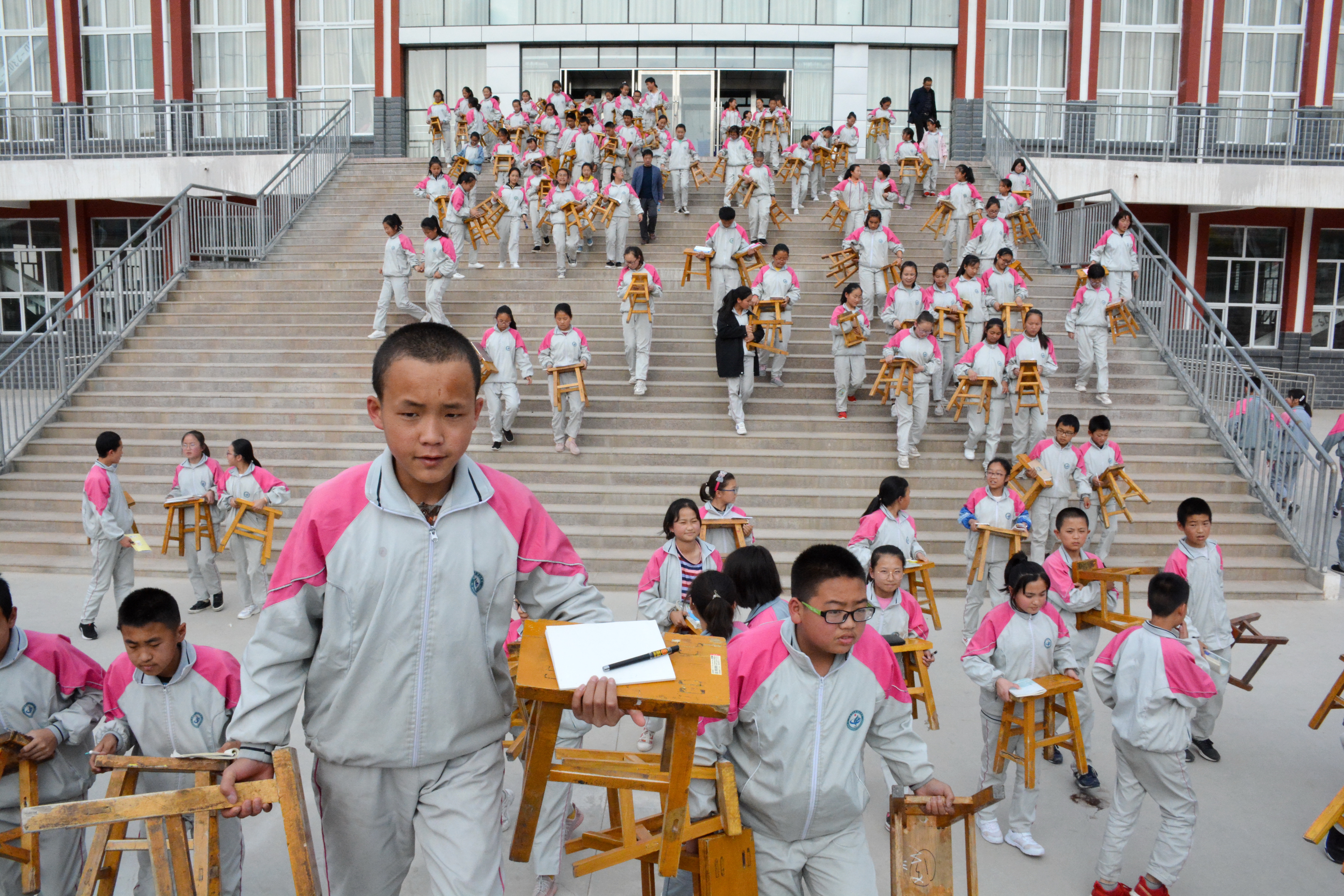 5月30日,宁夏海原二中的中学生听完中国科大杨圣老师《传感技术科普报告》后,抱着自带的板凳返回教室。