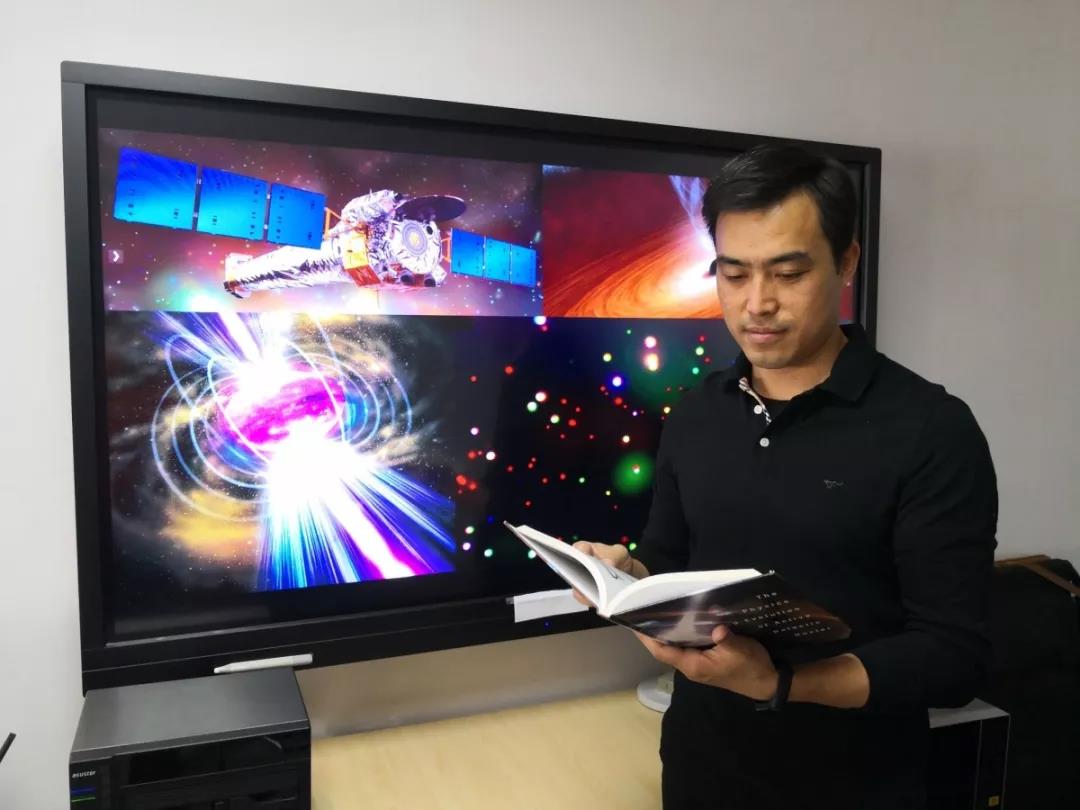 薛永泉教授。背景左上为钱德拉X射线空间望远镜(该望远镜探测到了这颗磁星),左下为遥远宇宙中神秘磁星的假想图;右上为活动星系核的假想图(薛永泉的主要研究天体之一);右下为由钱德拉空间望远镜完成的迄今最为灵敏的X射线巡天的部分天区图像(正是这一系列观测中的一个捕获了这颗磁星)。(盛振峰摄)