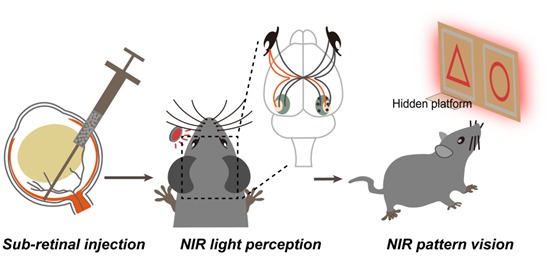 为解决上述问题并发展裸眼无源红外视觉拓展技术,中国科大薛天教授研究组同美国马萨诸塞州州立大学医学院韩纲教授研究组合作,尝试利用一种可吸收红外光发出可见光的上转换纳米材料,导入动物视网膜中以实现红外视觉感知。体外感光细胞单细胞光电生理记录证实这种纳米材料确实可以吸收红外光后激发小鼠视杆细胞电活动。为了缩短纳米颗粒与感光细胞的距离,从而提高红外敏感度,并使其能够长时间的留存在视网膜感光细胞层,研究人员发展了一种特异表面修饰方法,使其可以与感光细胞膜表面特异糖基分子紧密连接,从而牢牢地贴附在感光细胞感光外段的表面。研究人员通过多种神经视觉生理实验,从单细胞电生理记录,在体视网膜电图(ERG)和视觉诱发电位(VEP),到多层面的视觉行为学实验,证明了从外周感光细胞到大脑视觉中枢,视网膜下腔注射纳米颗粒的小鼠不仅获得感知红外线的能力,还可以分辨复杂的红外图像。