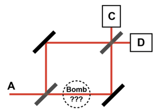 反事实直接量子通信,本质上是光的“波粒二象性”的集中体现。该方案最初的灵感来自于1993年提出的“炸弹测试模型”。如图1所示,MZ干涉仪有两个入口记为A和B,两个出口记为C和D,有上下两臂。如果下臂中可能存在一个非常敏感的炸弹,即使只有一个光子遇到它,也会被其吸收并引发爆炸。为了探测炸弹是否存在,可以从A端向干涉仪中发射一个光子。如果炸弹不存在,由于干涉,光子将一定从端口C离开;如果炸弹存在,则光子要么通过下臂被炸弹吸收,要么通过上臂,并以相同的概率从端口C或D离开。因此,如果最终在端口D探测到一个光子,那么炸弹一定存在于干涉仪中且一定没有光子通过炸弹,然而我们却得到了炸弹存在的信息。这在后来被称为“无相互作用测量”。在此基础上,再利用量子芝诺效应,可以大大提升上述无相互作用测量的成功率。