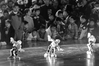 10月15日,中国科学技术大学第十六届RoboGame机器人大赛开赛,7支手工艺术机器人队伍与32支物流竞速机器人队伍分别进行比拼。图为终场机器人舞蹈表演。