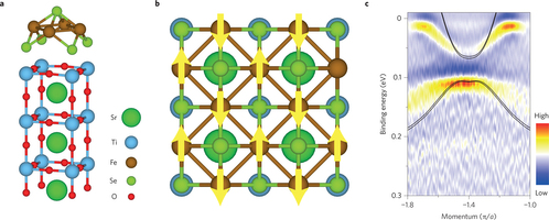 Monolayer FeSe/STO exhibits a superconducting transition temperature (Tc) of nearly 70 K (ref.2). This is a dramatic enhancement of the Tc of 8 K in bulk FeSe (ref. 3), the electronic structure of which features the presence of both hole pockets around the centre (Γ point) of the Brillouin zone and electron pockets around the corner (M point). Although still a matter of debate, this large change in Tc might be driven by the crystal structure, as illustrated in Fig. 1a. Since there is an in-plane lattice mismatch of ~3.6% with the substrate, the FeSe film is expected to suffer a substantial tensile strain under which the bulk hole pockets around Γ could disappear as observed in photoemission spectra. With these results in mind, Zhengfei Wang and co-workers carried out first-principles band structure calculations for various magnetic orders in FeSe/STO. By comparing their theoretical predictions with the photoemission observations, they identified a checkerboard antiferromagnetic (CAFM) order, as schematically depicted in Fig. 1b, to be a good match, adducing the need for the inclusion of effects of electronic correlations beyond those of just strain to explain the absence of hole pockets. Moreover, taking a hint from a previous study4, they found that by including spin–orbit coupling (SOC) within the CAFM order a small gap (~40 meV) opened at the M point, a feature also seen in the photoemission spectra and shown in Fig. 1c. Importantly, the opening of such a gap leads to band inversion, which was monitored by computing a non-vanishing, symmetry-protected (the sz component of the spin is conserved), bulk topological invariant named the spin Chern number. This was confirmed experimentally via scanning tunnelling spectra, which showed significant differences in local densities of states between the bulk and edge portions of the sample. These results are consistent with the theoretical predictions, and justify the claim of the existence of a topological state in FeSe/STO.