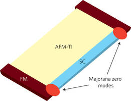 According to Zhengfei Wang and colleagues, FeSe/STO behaves like a superconductor with electron doping ('n-type') but is expected to achieve an antiferromagnetic topological insulator state with extra hole doping (until the Fermi level shifts to an energy position within the gap, dubbed p-type). These features should enable the realization of Majorana fermions (zero modes), which are their own anti-particles, with enormous potential for quantum computing applications. A proposal5is sketched in Fig. 2, where a region in the topological insulating state is in proximity of a region in the superconducting state. The underlying idea is simple: in order to make fermions 'real', the particle–hole symmetry of a superconductor erases the distinction between positive and negative charges; the spin-momentum locking in a topological insulator then makes electrons effectively spinless and eliminates the energy difference from zero-point motion6. Such a configuration could be fabricated within a single FeSe layer as a p–n junction by suitable gating. With ferromagnetic insulators to confine the two Majorana modes at both ends, a two-level state will be formed as a basic quantum qubit, which can non-locally encode useful information.