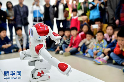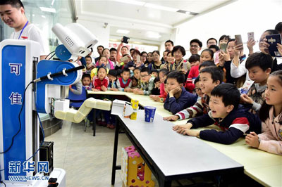 5月14日,在中国科学技术大学“公众开放日”活动上,合肥市黄山路社区孩子观看“可佳服务机器人”表演。当日,以“创新引领 共享发展”为主题的2016年全国科技活动周启动,各地举行丰富多彩的科普活动。 新华社记者 刘军喜 摄