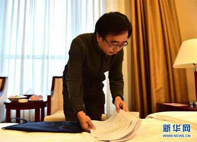 3月4日,全国政协委员潘建伟在驻地房间整理材料。