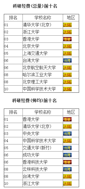 “科研经费”方面,总量前十名中大陆高校共有8所,其中清华大学(北京)以近40亿元的数额继续领跑两岸四地高校;但师均“科研经费”前十名中大陆仅3所。
