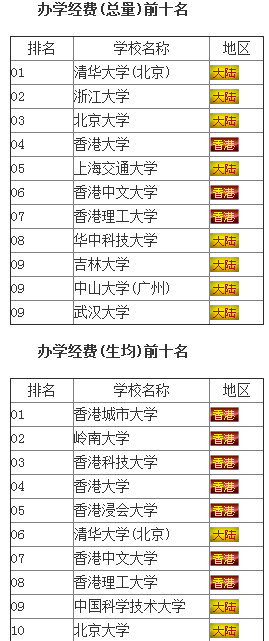 “办学经费”总量前十名中有8所高校来自大陆,较去年排名增加2所,清华大学(北京)以82亿人民币的数额雄踞榜首,浙江大学、华中科技大学、吉林大学、中山大学(广州)、武汉大学等进入指标前十的高校的“办学经费”也均有较大幅度增长;台湾地区办学经费总量最高的是台湾大学,但今年名次下降至第12名;香港高校在生均“办学经费”方面延续往届优势,囊括该指标前五名,大陆地区有3所大学进入前十名,澳门和台湾地区生均经费最高的澳门大学和阳明大学分别位于第13名和第15名。