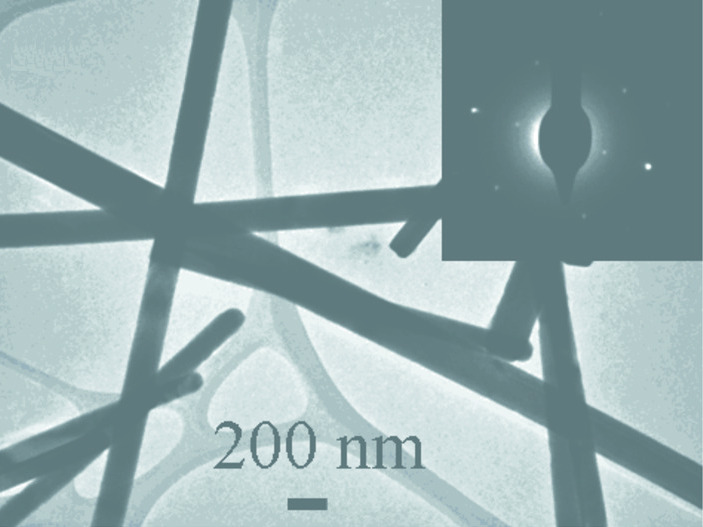 | This is a typical TEM image of as-prepared GeS nanowires with the inset showing a selected area electron diffraction pattern taken from GeS nanowires. Credit: Liang Shi and Yumei Dai |
