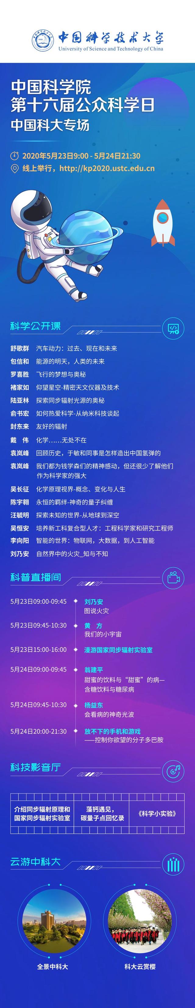 据悉,本届公众科学日以“云游中科院 畅想新生活”为主题,为期两天,旨在弘扬科学精神、传播科学思想、倡导科学方法,普及科学知识,努力提升全民科学素养,助力全面抗疫工作大局。
