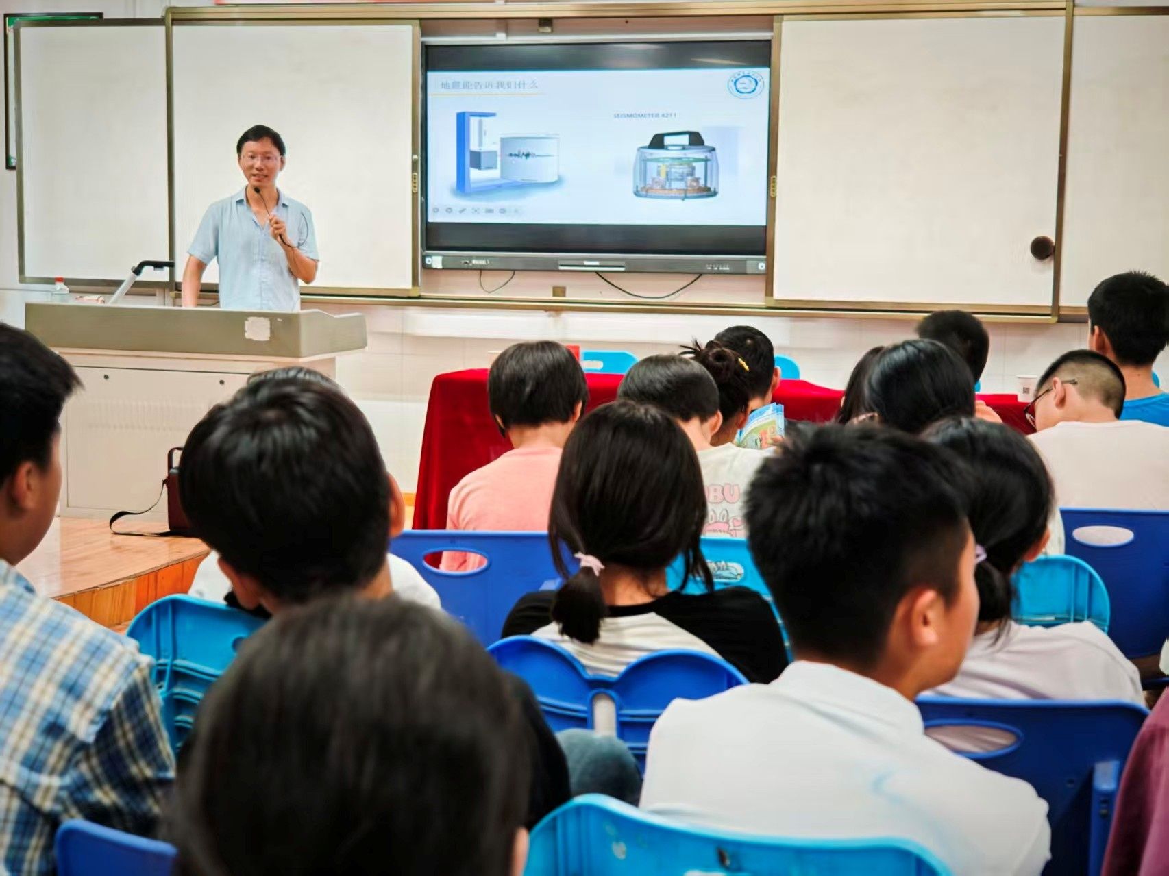 本次活动特邀中国科学技术大学地球和空间科学学院胡峰副教授,带来的课题为《和地震对话》的科普讲座,为肥西梁岗学校师生们带来了一场兼具知识性与趣味性的地震科普盛宴。