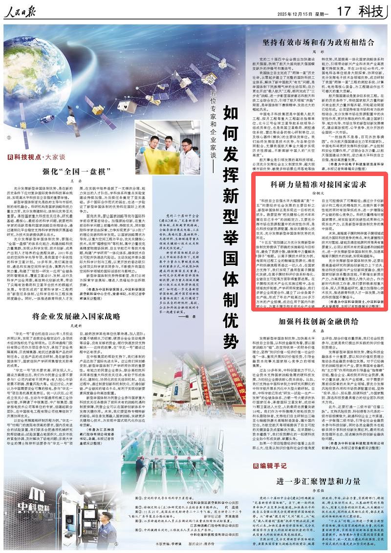 新型举国体制为民营企业参与国家重大科技攻关任务提供了前所未有的战略机遇和制度保障,民营企业可以在国家创新体系中发挥关键作用。未来,我们要坚持专精特新的路径,将自身发展融入国家战略,突破更多关键核心技术,为实现中国式现代化作出应有贡献。