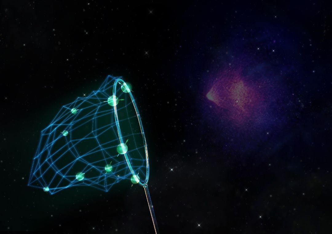 概念图:基于城际量子传感网络的暗物质搜寻示意图。由位于合肥中国科学技术大学的四台量子传感器与位于杭州浙江工业大学的一台量子传感器组成的暗物质探测网络像一张大网,在宇宙中捕捉微弱的潜在暗物质信号