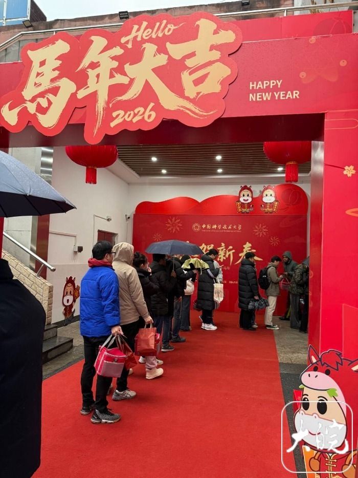 2月16日傍晚,合肥下起小雪,与户外的寒冷相比,中国科大东校区东苑学生餐厅内却是暖意融融。在餐厅的一楼入口,已经铺上了红地毯,挂起了红灯笼,“恭贺新春”的标识牌随处可见,同学们在志愿者的引导下有序排队入场。餐厅内部也进行了特别的布置,不仅设置了“新年许愿墙”,还有“一马当先,马到功成”打卡点,红色的电子屏幕上显示着“祝老师、同学们新年快乐!”