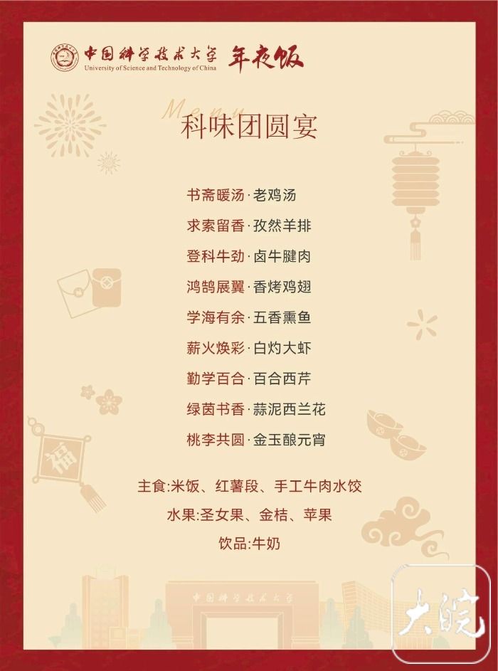 每年春节,网上总有中国科大学生晒出那张科味团圆宴菜单——“这就是我们在学校吃的年夜饭”。今年寒假,中国科大又有超过500名学生留校,他们大多是泡实验室、赶课题、赶论文的同学。