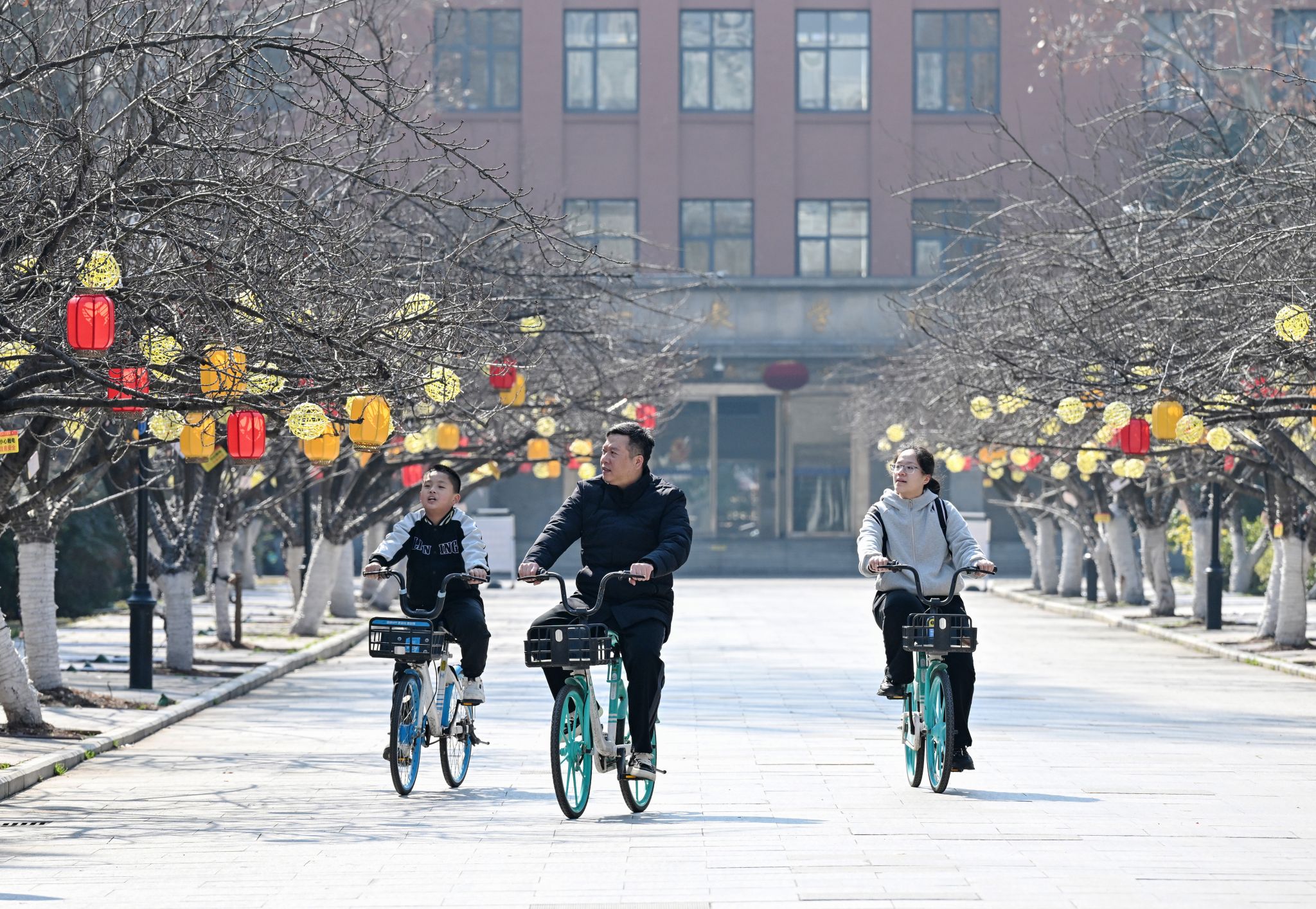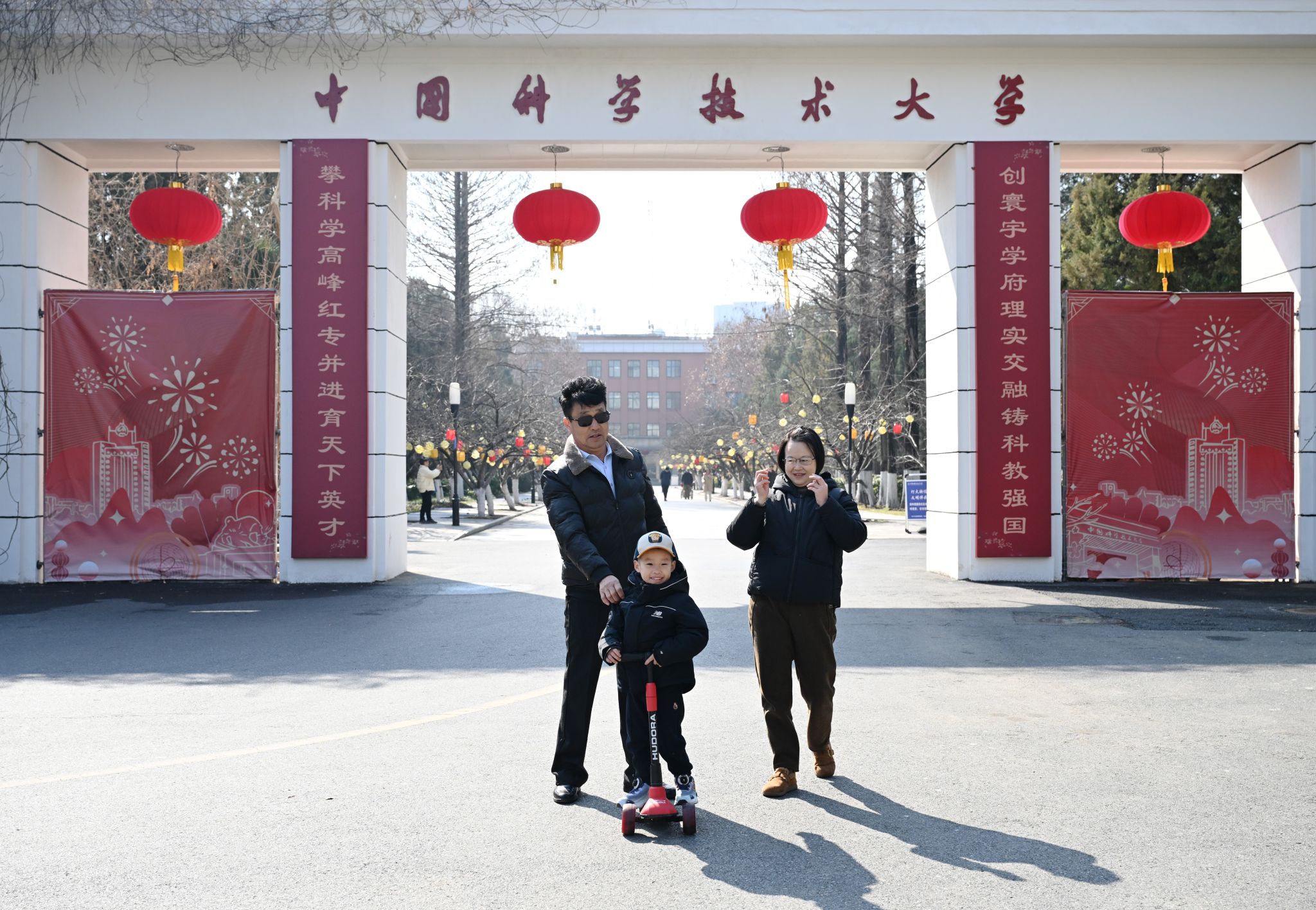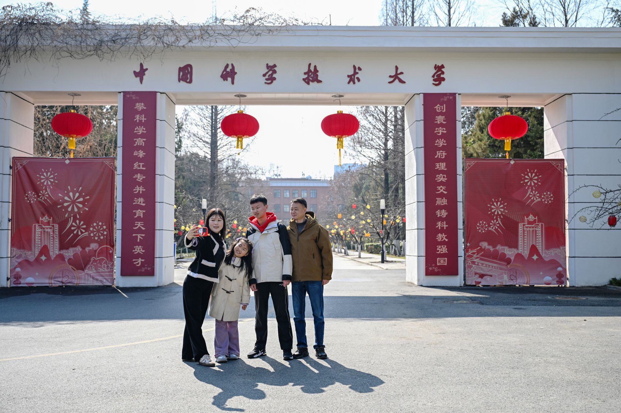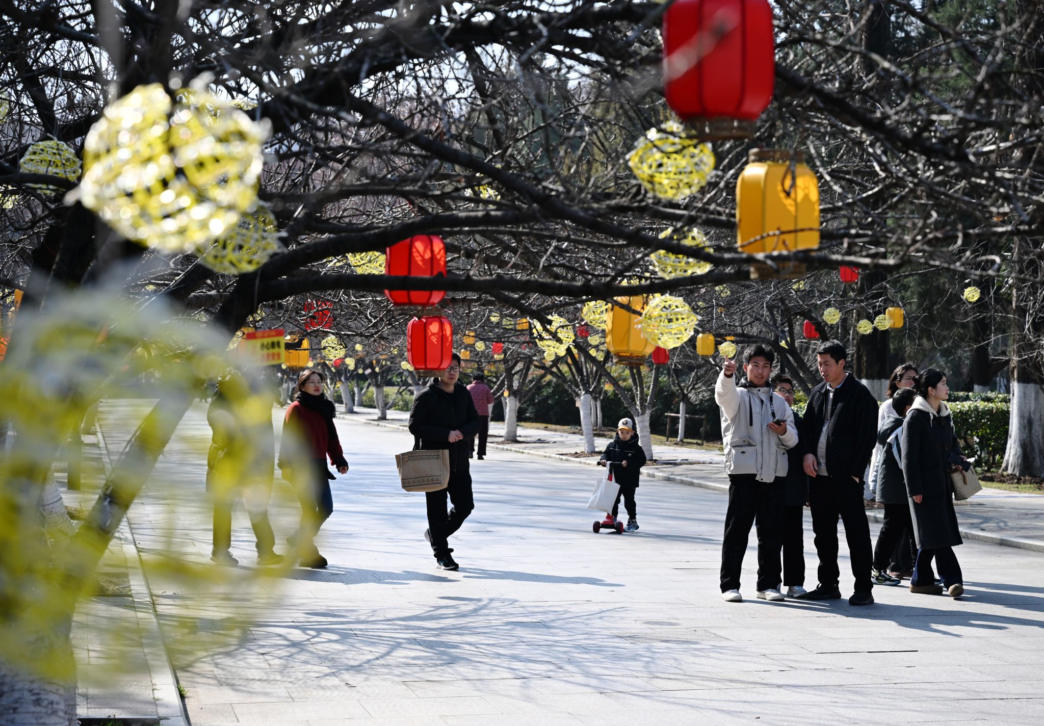 2月18日,在央视春晚合肥分会场取景地中国科大老北门,樱花树上挂满灯笼,市民游览留影。