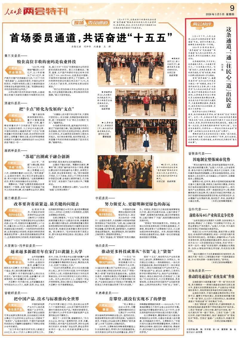 首场“委员通道”上,潘建伟委员用“运行300亿年误差不超过一秒”的精度,讲述了中国科技的自立自强;黄三文委员用“无人机成为新农具”的实践,道出中国粮食高位丰收的密码;王勇峰委员用自己带领队员为珠峰测高的攀登故事,启发我们在中国式现代化建设中,只要秉持攀登精神、勇毅笃行,就没有越不过去的险峰、实现不了的梦想……