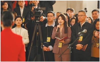 3月4日,全国政协十四届四次会议首场“委员通道”集体采访活动在人民大会堂举行。这是本报记者闫伊乔在提问。本报记者 张武军摄