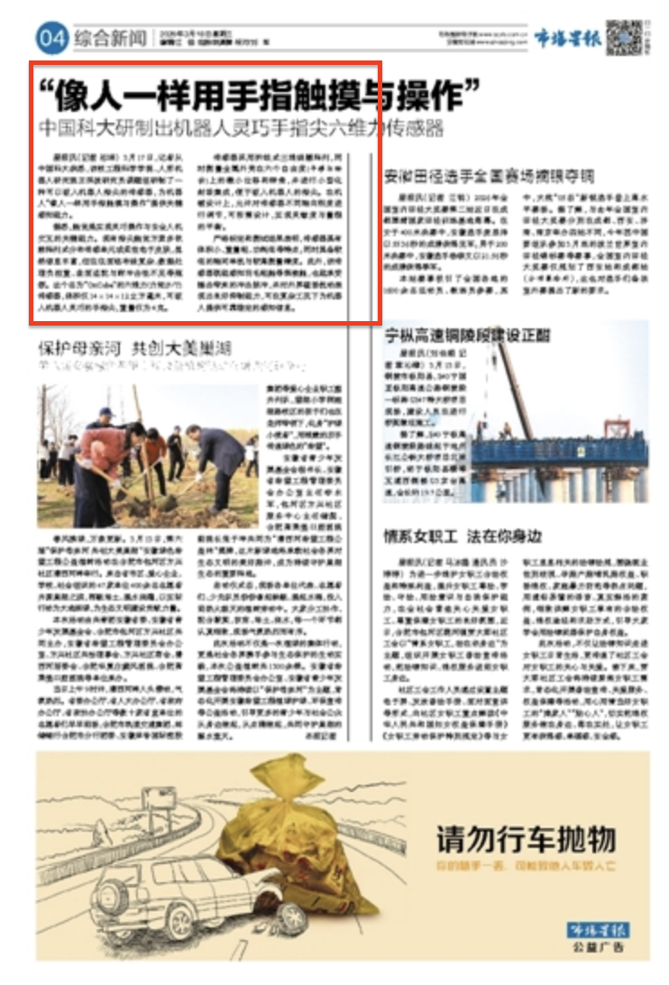 星报讯 3月17日,记者从中国科大获悉,该校工程科学学院、人形机器人研究院王洪波研究员课题组研制了一种可以嵌入机器人指尖的传感器,为机器人“像人一样用手指触摸与操作”提供关键感知能力。