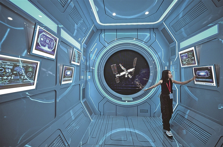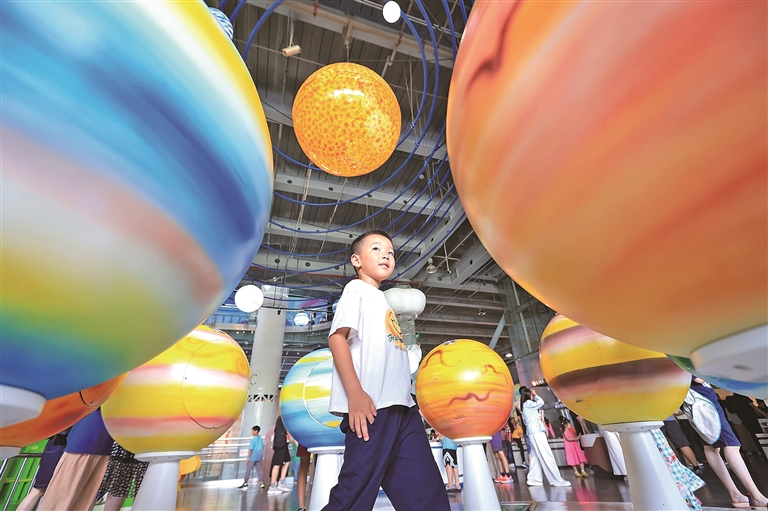 小朋友在江苏南京科技馆观看科普装置。新华社发