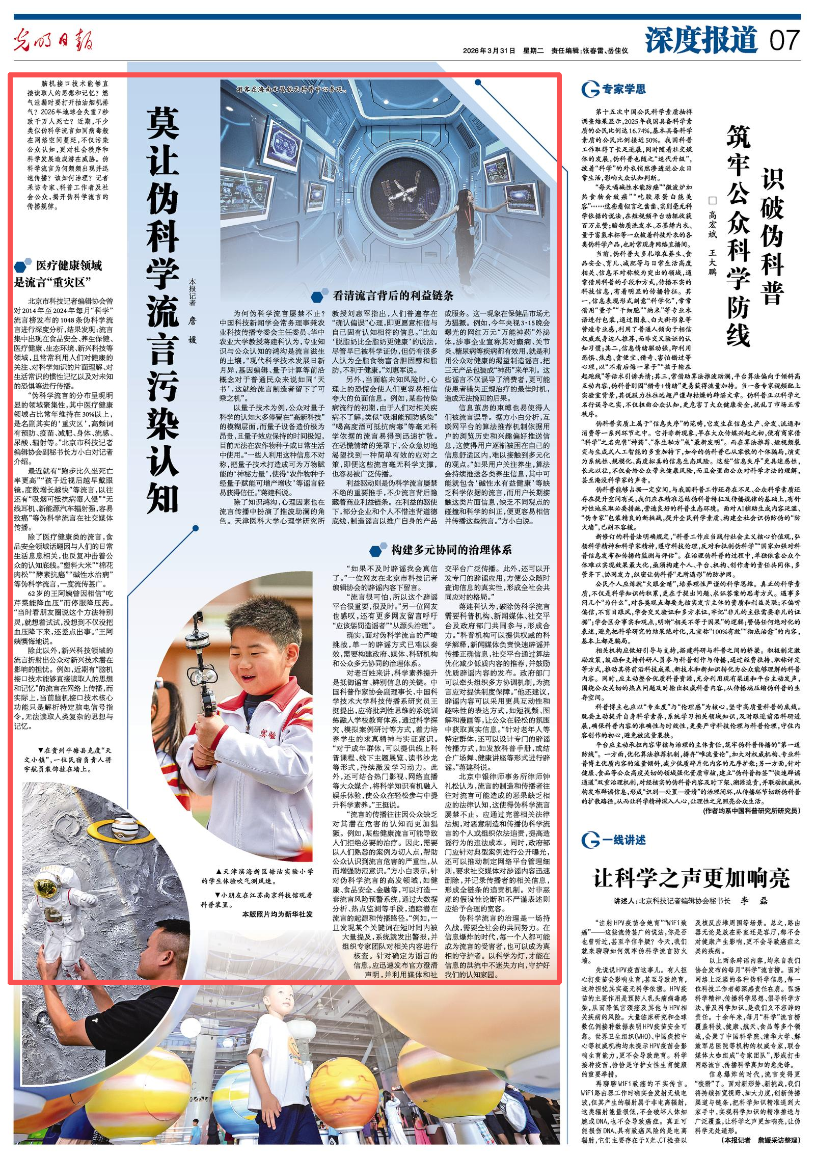 对老百姓来讲,科学素养提升是抵御谣言、辨别信息的关键。中国科普作家协会副理事长、中国科学技术大学科技传播系研究员王挺提出,应将批判性思维的系统训练融入学校教育体系,通过科学探究、模拟案例研讨等方式,着力培养学生的求真精神与实证意识。“对于成年群体,可以提供线上科普课程、线下主题展览、读书沙龙等形式,持续激发学习动力。此外,还可结合热门影视、网络直播等大众媒介,将科学知识有机融入娱乐体验,使公众在轻松参与中提升科学素养。”王挺说。