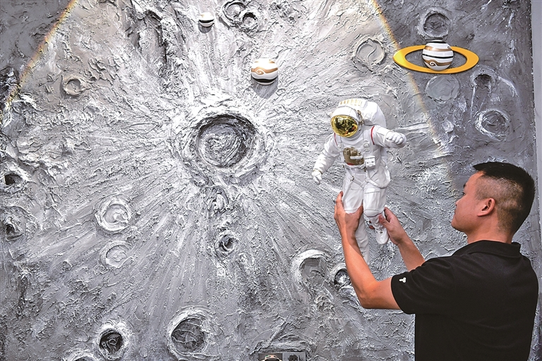 在贵州平塘县克度“天文小镇”,一位民宿负责人将宇航员装饰挂在墙上。新华社发