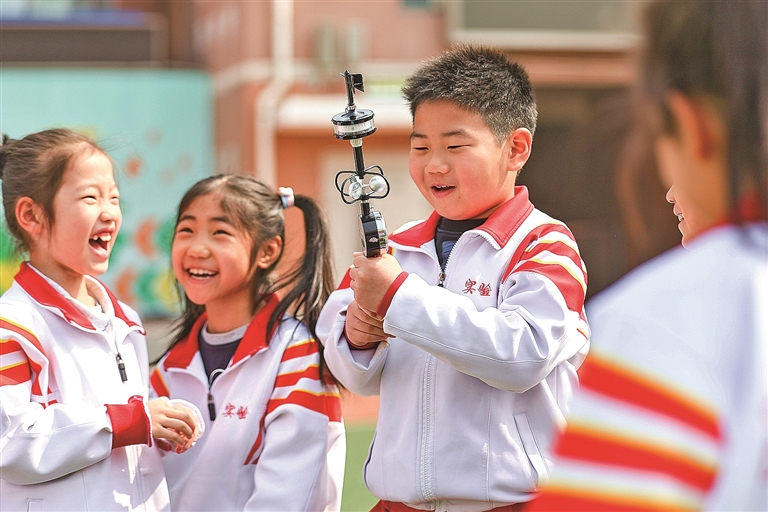 天津滨海新区塘沽实验小学的学生体验吹气测风速。新华社发