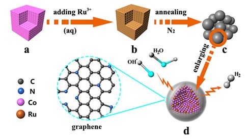 RuCo@NC纳米粒子的合成路径和结构模型示意图。(a) Co3[Co(CN)6]2,(b) Ru掺杂的Co3[Co(CN)6]2,(c) RuCo@NC纳米粒子的聚集体示意图,(d) c中一个RuCo@NC纳米粒子放大的模型示意图,并简单描述了作为电催化剂在碱性介质中的析氢过程。