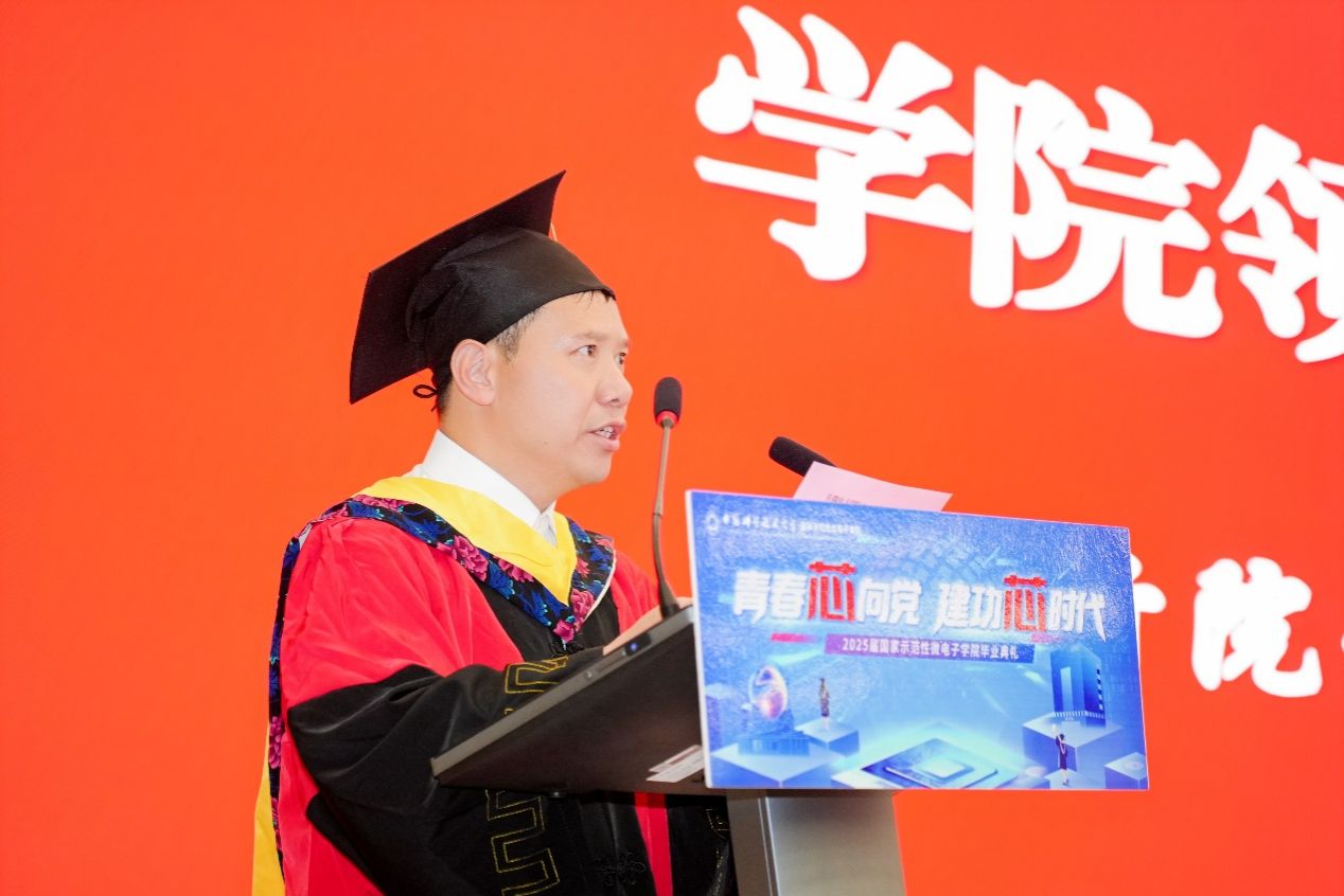 在热烈的掌声中,执行院长龙世兵发表了致辞。他代表学院全体教职工,向2025届毕业生表示热烈祝贺,并向毕业生的父母、师长和亲友表示衷心感谢。龙世兵回顾了学院与同学们共同奋斗的历程和取得的成就。他指出,作为与新时代同频共振的“科大微电人”,既肩负着“强国一代”的使命,更承载着“芯火相传”的担当,他寄语全体毕业生:要不忘初心,牢记爱国“芯”,在科技自立自强的征程上破解“卡脖子”难题;要饮水思源,常怀感恩“芯”,在奉献中书写“大我”价值;要五育兼修,夯实体魄“芯”,努力成长为德智体美劳全面发展的“六有”大学生。