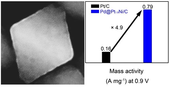具有超薄铂镍合金原子层的新型纳米催化剂(左)及其在催化氧还原反应中的铂原子单位质量活性(右)
