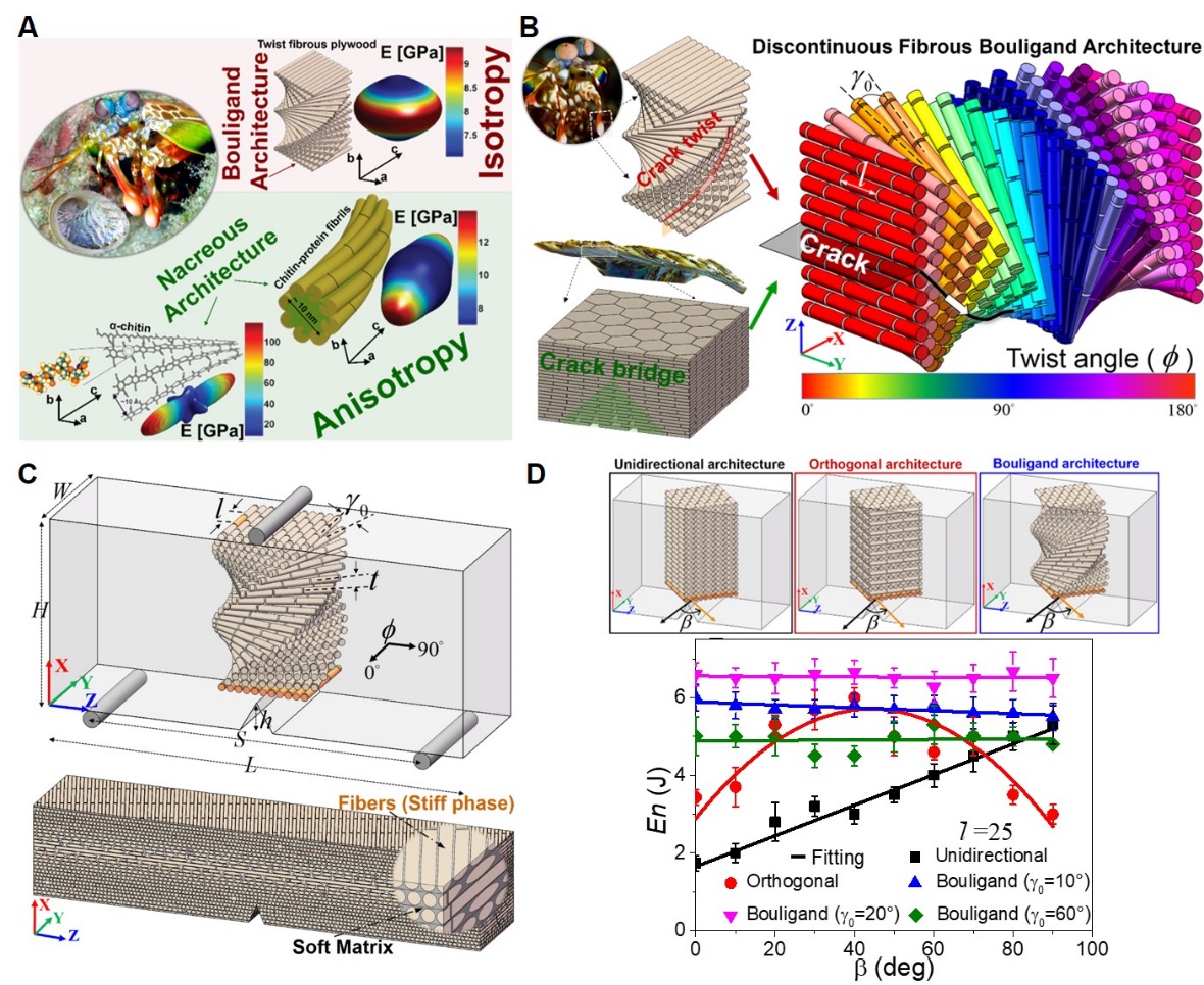 生物界“矛”与“盾”式的捕食者与被捕食者之间的生存战争启发人们,调控材料微结构是结构材料获取超常力学性能的重要途径。受自然界“螳螂虾锤击贝壳”的捕食现象启发,中国科学技术大学倪勇教授、何陵辉教授研究团队与合作者将螳螂虾内的扭转结构与贝壳珍珠层内的“砖泥”交错结构相结合,利用3D打印技术设计了一种高断裂韧性和对裂纹取向不敏感的非连续纤维扭转复合结构,并提出断裂力学模型揭示了裂纹取向不敏感、裂纹扭转和纤维桥联协同的增韧机制,给出了具有最优断裂韧性的此类复合材料结构的参数化设计策略。相关研究成果以“Discontinuous fibrous Bouligand architecture enabling formidable fracture-resistance with crack-orientation insensitivity”为题,于2020年6月22发表在《美国科学院院刊》(Proceedings of the National Academy of Sciences of the United States of America, PNAS)。