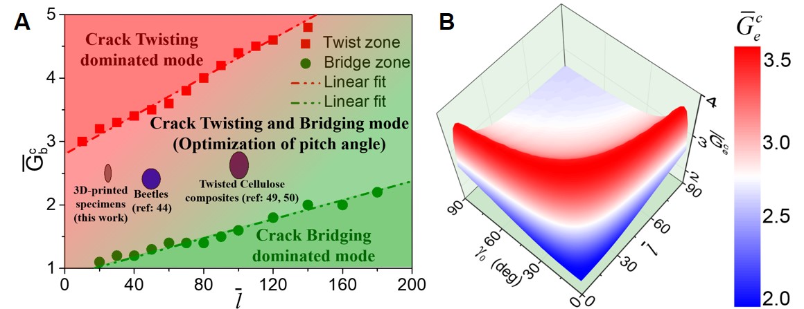 针对上述问题,研究团队将扭转结构和“砖泥”交错结构组合,3D打印设计了一种非连续纤维扭转(DFB)复合结构,系统的断裂实验表明,该结构优异的断裂耗能对初始裂纹取向不敏感,同时在临界螺旋角下断裂耗能最优(图1)。断裂力学分析表明,对裂纹取向不敏感的高断裂韧性起源于DFB结构中的裂纹偏转和桥联协同的混合增韧机制;存在临界螺旋角,裂纹偏转和桥联模式间的协同导致最优断裂耗能(图2)。通过调控螺旋角、纤维长度、扭转角分布和桥联韧性参数,可以实现适应各方向载荷的高韧性纤维复合结构设计。