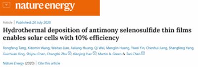 近日,中国科学技术大学陈涛教授、朱长飞教授团队,与新南威尔士大学的Xiaojing Hao教授等合作,发展了水热沉积法制备硒硫化锑(Sb2(S,Se)3)半导体薄膜材料并将其应用到太阳能电池中,实现了光电转换效率10%的突破。该成果以“Hydrothermal deposition of antimony selenosulfide thin films enables solar cells with 10% efficiency”为题发表在Nature Energy。