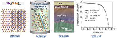 硒硫化锑,其化学式为Sb2(S,Se)3,是近年来在光伏领域应用的一种新兴光伏材料,其带隙在1.1-1.7 eV范围内可调,满足最佳的太阳光谱匹配。同时,Sb2(S,Se)3具有较高的吸收系数,五百纳米左右厚度的薄膜即能达到最佳吸收;因此,在超轻、便携式发电器件方面也具有潜在的应用。