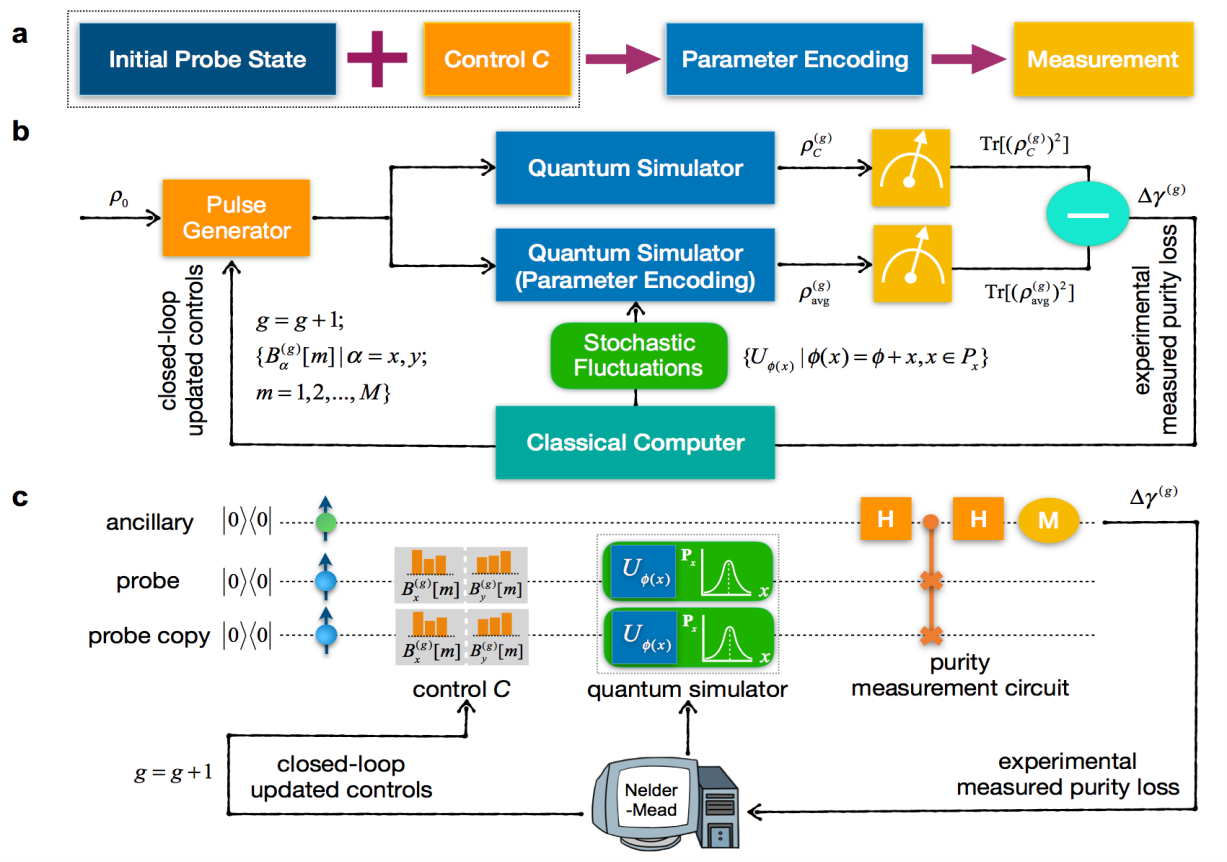 上图:利用闭环学习控制进行量子度量探针态优化的流程。下图:实验中实现量子度量探针态优化的线路。
