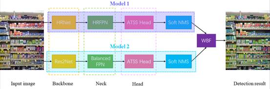 中国科大团队解决方案由两个模型组成,它们均基于ATSS的检测框架。两个模型分别采用了当前检测效果最好的两种Backbone网络:HRNet以及Res2Net。两种Backbone网络都能够提取多种尺度的特征并进行有效融合,可以为小尺度的目标提供丰富的语义特征,非常适用于小目标检测任务。为了充分利用不同Backbone网络的表达能力,团队首先使用两个模型分别进行检测,然后通过加权检测框融合技术(WBF)将其融合为最终检测的结果。此外,为了进一步提高检测精度,团队还采用了数据增强、多尺度训练、多尺度测试、余弦退火调整学习率等技术。