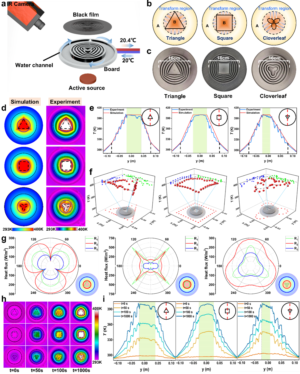 热超材料(Thermal Metamaterials)是一类人工设计的热学材料,目的是通过设计材料热传输性质来规划材料内的热流路径,适用于那些常规热管路系统难以胜任的热传输管理场合,比如热隐身、热聚焦,甚至热幻觉等特殊热功能(图1a)。在数学上,热超材料设计就是根据目标温度场,对无源傅里叶传热方程进行坐标变换,从而获得材料热传输物性张量空间分布。但在热应用中,无论是能源高效率热利用还是集成电路的高效散热,热源管理才是问题的核心。为此,作者成功研究了坐标变换框架下求解有源傅里叶传热方程的两步法(图1b-e),并通过设计典型热功能器件及其新形式,从理论到实验证明了新理论的兼容性与扩展性(图2)。本文工作为热超材料与热源紧密结合,实现能量收集部件、高功率散热部件等结合热超材料的一体化设计提供了通用设计理论。